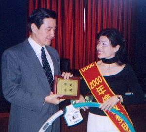 The marketing manageress represented TOPTELL to be awarded by the President of Taiwan, Mr. S. B. Chen in November 2000. |